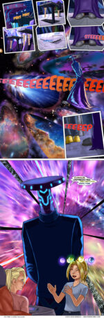 Oh, one other thing. Originally this was a standard sized page, but I’m really getting tired of cramming important moments into panels the size of 1/9th of a page. So I expanded this one, and I will probably do it more in the future. It doesn’t necessarily mean I can make those big panels all crazy high detail or anything. It’s not like I suddenly have a team of background guys that can draw 3-point perspective cityscapes for me while I concentrate on foreground art. I just want to give the important moments a little more weight, and in comic lingo, that usually means more page real estate.
